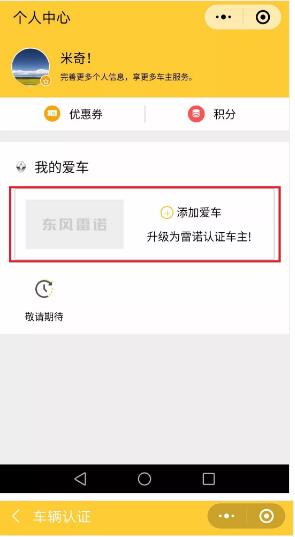 雷諾車主,廠家福利大派送 小諾準備大聲地告訴您: 是時候動動手 把小諾為您準備的精美禮品 帶回家啦! 一等獎:東風雷諾云伴遠程視頻車 二等獎:東風雷諾反向傘 方便車主而貼心設(shè)計,大雨來臨之時,只需小小的車門縫,就可以開收傘自如。 三等獎:東風雷諾定制手機支架 強韌有力的工藝設(shè)計,保證手機在行車途中不會晃動、掉落。讓開車接聽電話更安全。 諾米們是不是已經(jīng)按捺不住了 快跟著小諾 收下攻略,動動手指 把禮品帶回家吧! 先關(guān)注東風雷諾車友會官方微信公眾號 返回東風雷諾車友會主頁面,點擊左下角菜單欄【個人中心】,進入車主認證通道。 認真填寫愛車信息,上傳行駛證主頁、副業(yè)。在行駛證上能找到您的車輛識別代號和發(fā)動機號,再輸入手機號和驗證碼,即可綁定成功啦! 完成認證,便可以開始抽獎啦!注意:一位車主只有一次抽獎機會哦。 如您中獎,您將會收到一條中獎短信通知 務(wù)必在1個月內(nèi)憑中獎短信到武漢法雷專營店領(lǐng)取禮品 *注:本次活動僅限未認證會員的車主參與